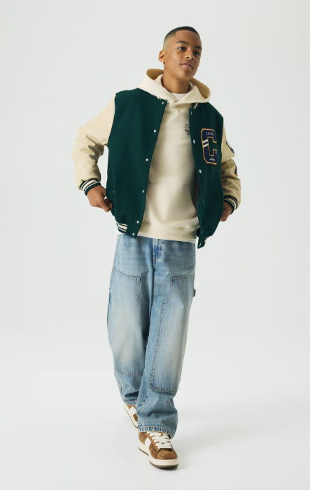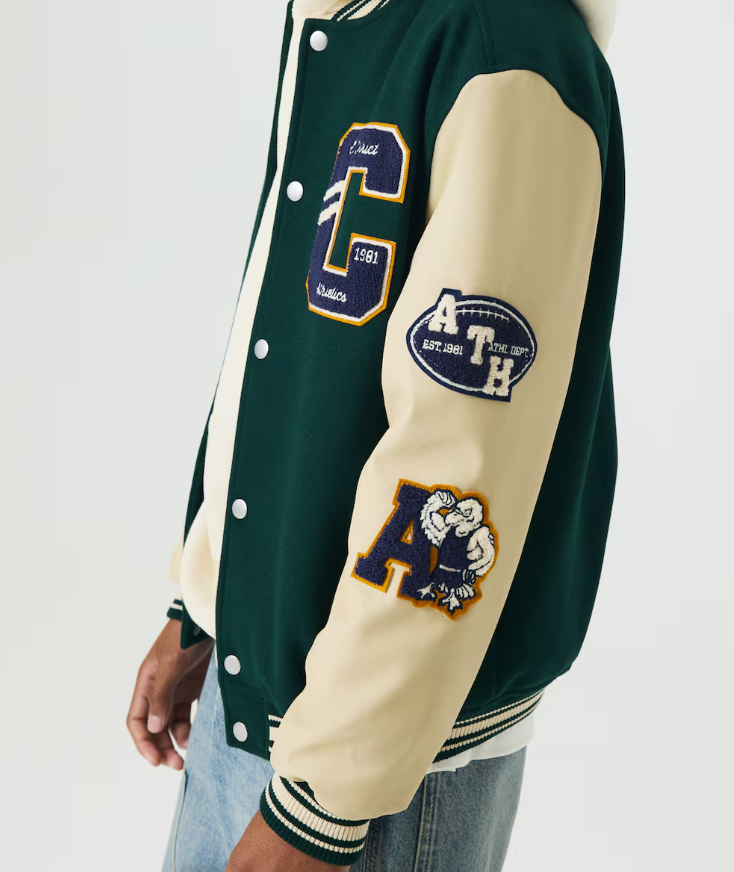 Effortlessly elevate street style with this varsity-inspired outfit. The dark green and beige jacket adds a classic, collegiate touch, while the soft hoodie and relaxed-fit light-wash jeans deliver all-day comfort. Finished with trendy brown-and-white sneakers, this ensemble is perfect for any casual outing, offering the ideal mix of comfort and modern edge.