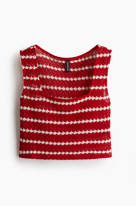Red and white striped crochet crop top featuring a sleeveless design and scoop neckline, perfect for a casual summer look.